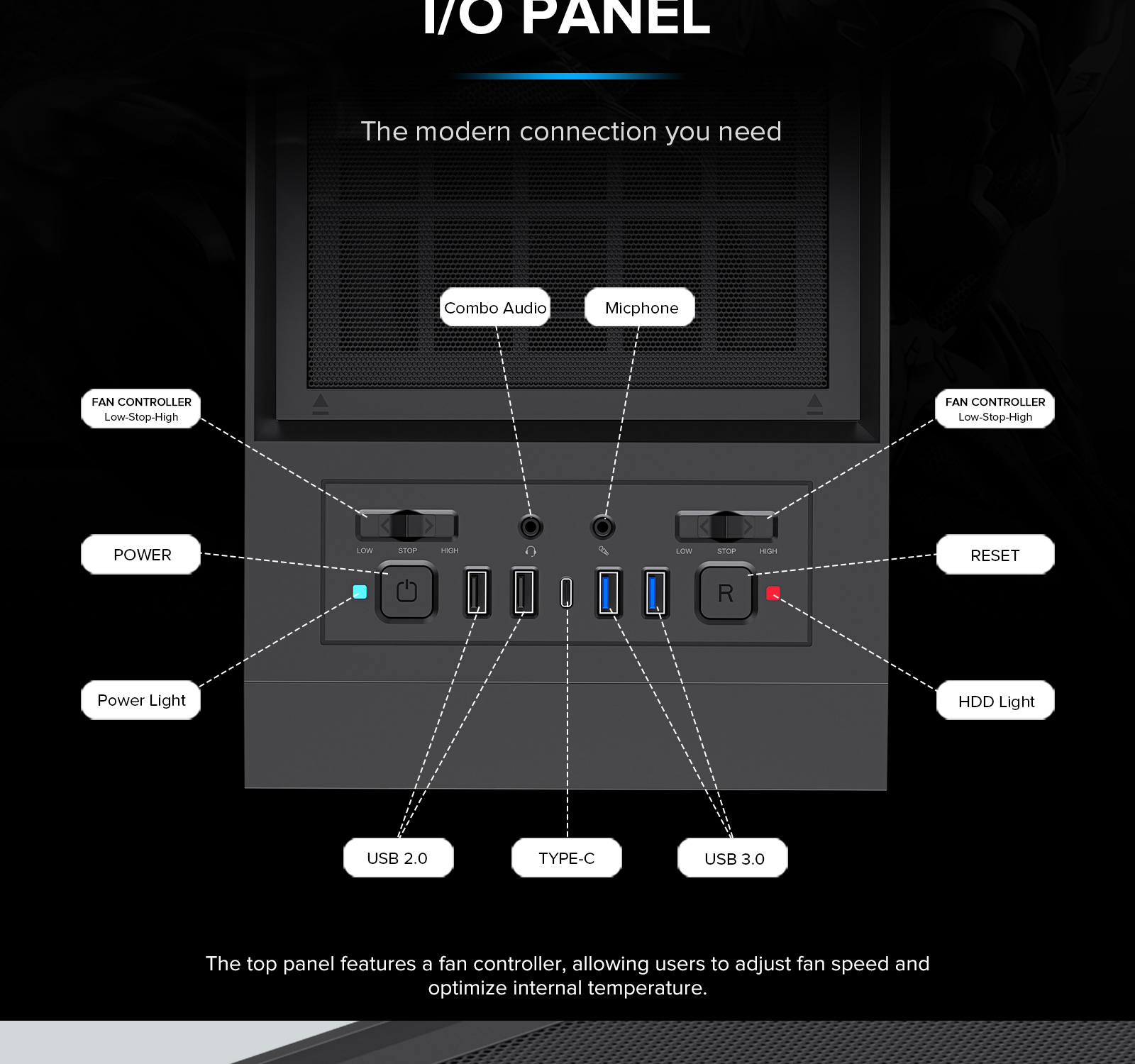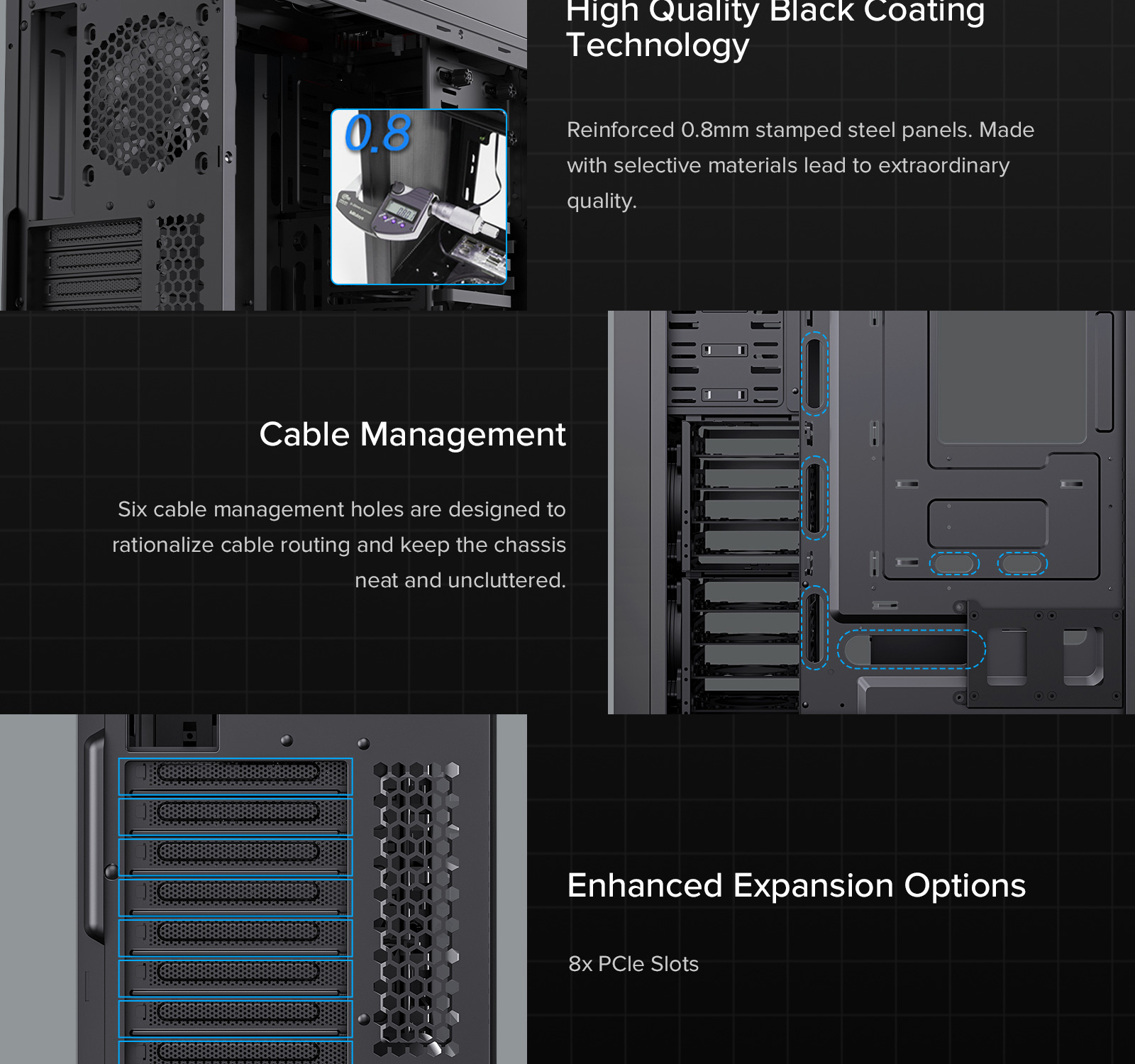 • Tempered glass panel for full-view display and dust-proof mesh panels for easy maintenance.
