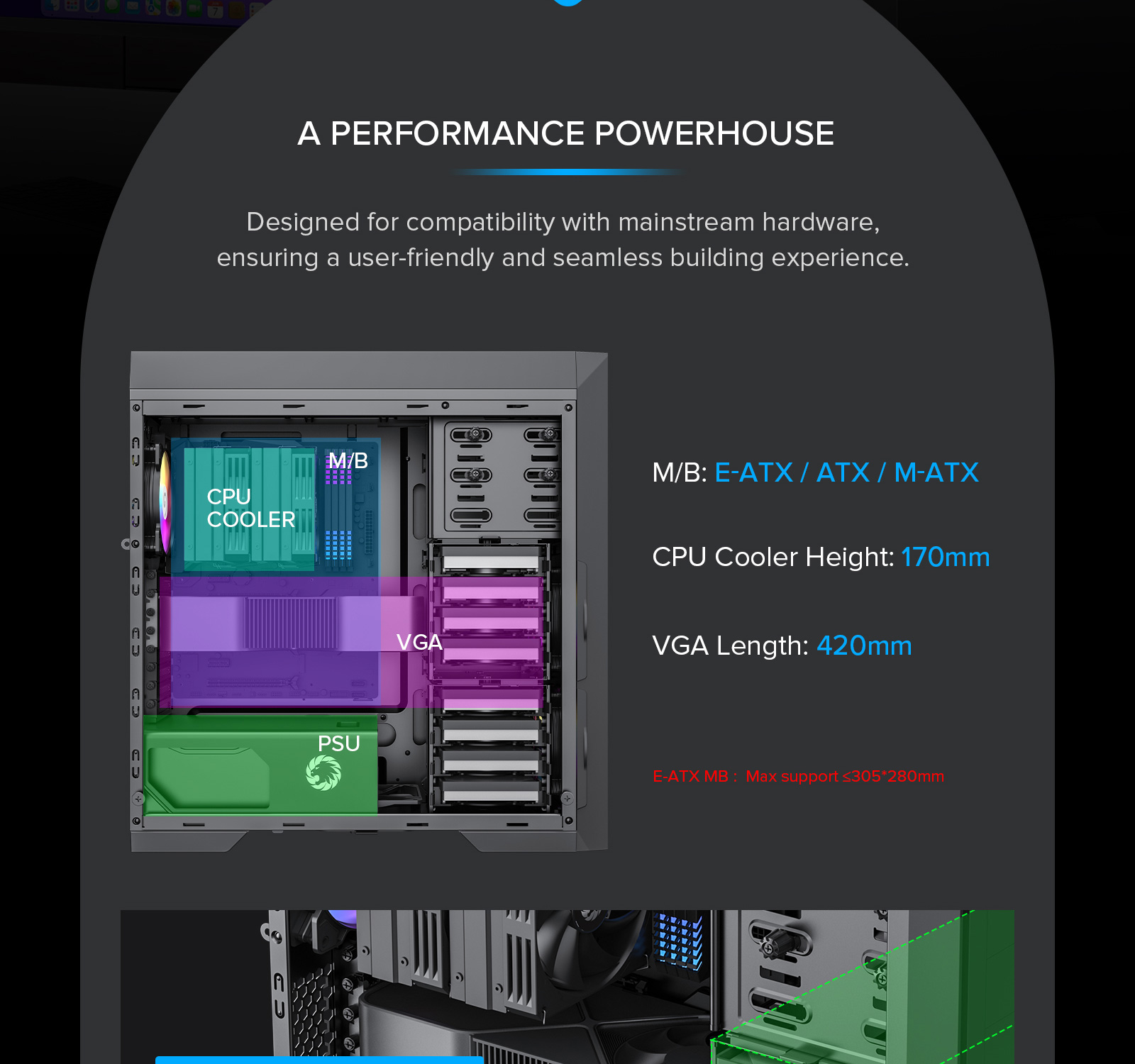 • Supports EATX, ATX, Micro-ATX, and ITX motherboards. Fits GPUs up to 420mm and CPU coolers up to 170mm.